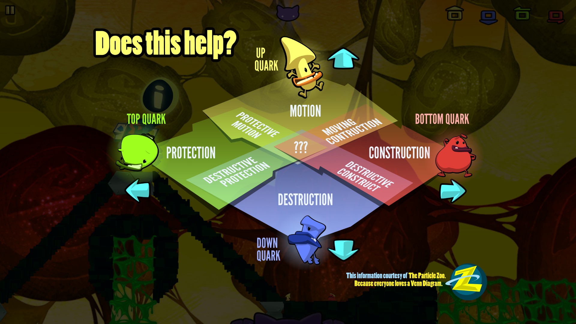 Οι συνολικά δώδεκα συνδυασμοί προσφέρουν μια σχετική ποικιλία που δεν αξιοποιείται όμως πότε πλήρως λόγω του προαναφερθέντος άσχημου level design. Οι περιοχές είναι ανοικτές με την έννοια ότι δεν υπάρχει περιορισμός σε scrolling μιας κατεύθυνσης αλλά αντιθέτως κινήστε ελεύθερα στο χάρτη (σκεφτείτε ένα σύγχρονο Earthworm Jim), κάτι που δεν βοηθά ιδιαίτερα ούτε τον ρυθμό του παιχνιδιού αλλά ούτε και τη δημιουργία ιδιαίτερων προκλήσεων. Παράλληλα με τα quarks, χειρίζεστε ασφαλώς και τη γάτα του Schrodinger μέσω των πλήκτρων WASD, αλλά η αφύσικη ανταπόκριση στις εντολές σας και το άγαρμπο animation δεν σας δίνουν περιθώριά για ουσιαστικό platforming.