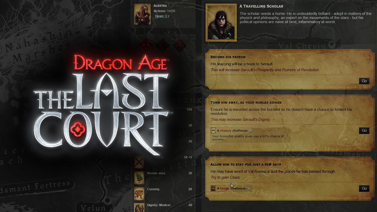 Με το Dragon Age: Inquisition να έρχεται στις 18 Νοεμβρίου για Xbox 360, Xbox One, PlayStation 3, PlayStation 4 και PC, η Electronic Arts έκανε διαθέσιμο το text adventure Dragon Age: The Last Court, εντελώς δωρεάν για όλους μέσω της υπηρεσίας Dragon Age Keep. Αρκεί να έχετε λογαριασμό χρήστη στο Origin.